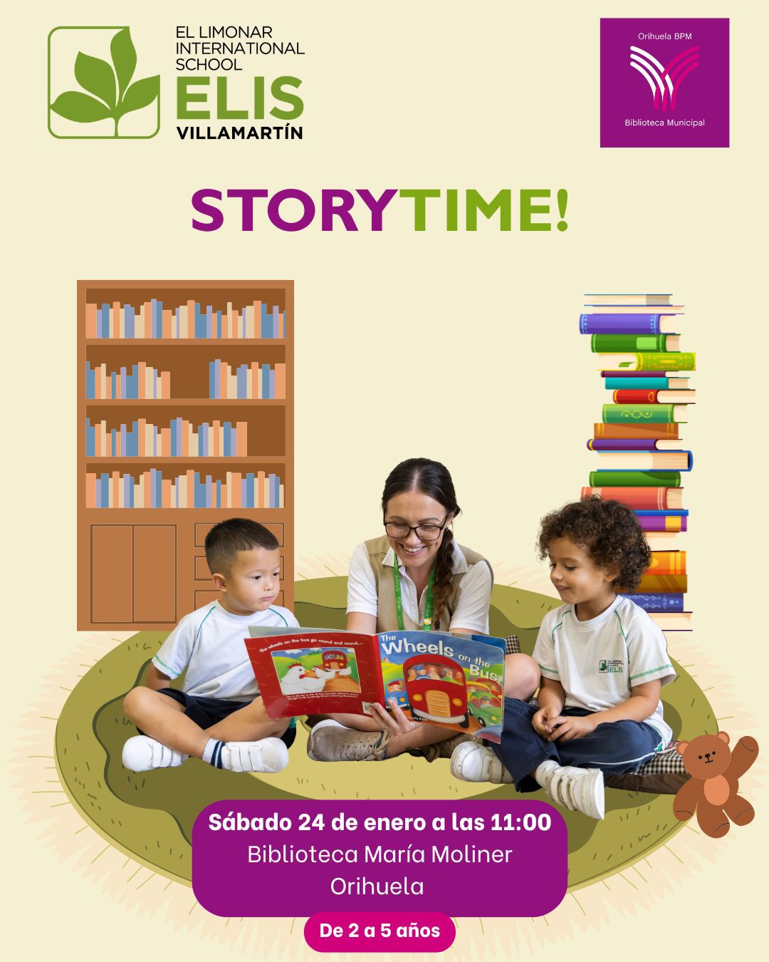 El próximo 24 de enero, a las 11:00 horas, la Biblioteca Pública Municipal ‘María Moliner’ de Orihuela será el escenario de una mágica sesión de cuentacuentos titulada ‘Storytime!’. Esta actividad, dirigida a niños y niñas de 2 a 5 años, es organizada por el Limonar International School Elis Villamartín en colaboración con la biblioteca.